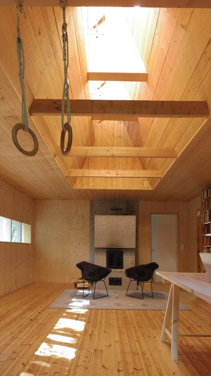 All the ceilings in the newly built rooms are covered with sawn untreated boarding. Using untreated wood allows you to enjoy a natural aroma and a unique atmosphere. The walls are insulated with Ecowool, made from recycled paper, and covered with plywood. The plywood is painted with transparent Osmo color oil wax with a hint of white pigment, which has kept it in excellent condition. All the floors are made of wooden floorboards, also painted with transparent Osmo colour floor oil wax. All the rooms are built without any baseboards.